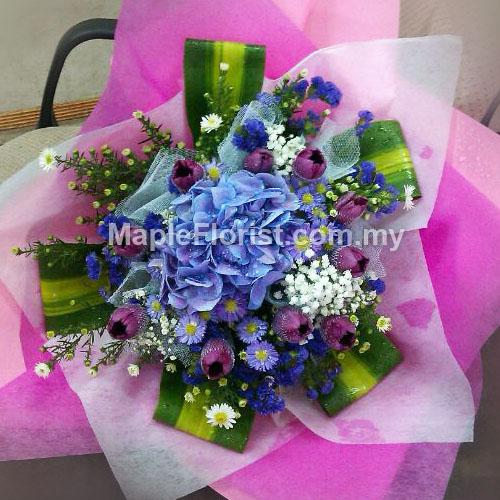 Hydrangea with tulips bouquet is a full and gorgeous mix of beautiful fresh flowers, Malaysia fresh Hydrangea Flowers online.