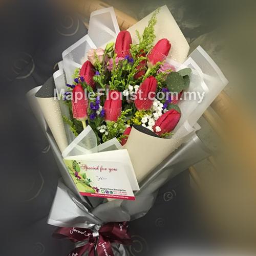 An elegant bunch of red tulips arranged elegantly with Korean style wrapping. This is a wonderful gift for just about any occasion.