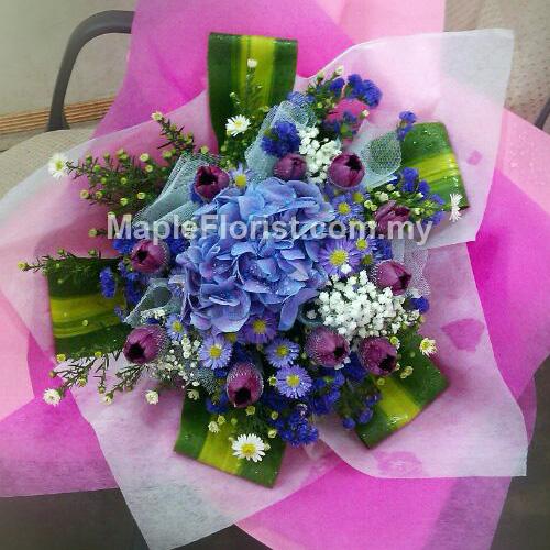 Bouquet with tulips, Hydrangea, available delivery between Johor Bahru, Malaysia. a perfect bouquet for your loved ones on Valentine's day.